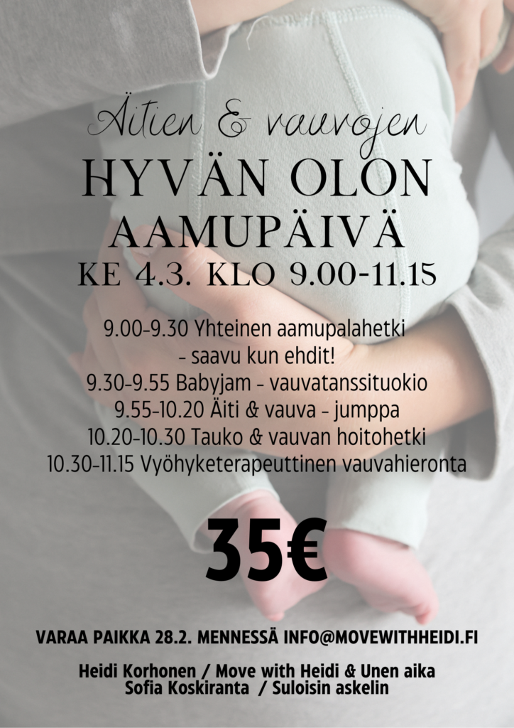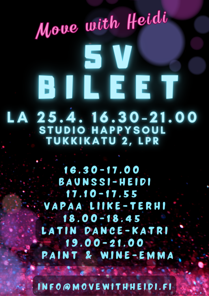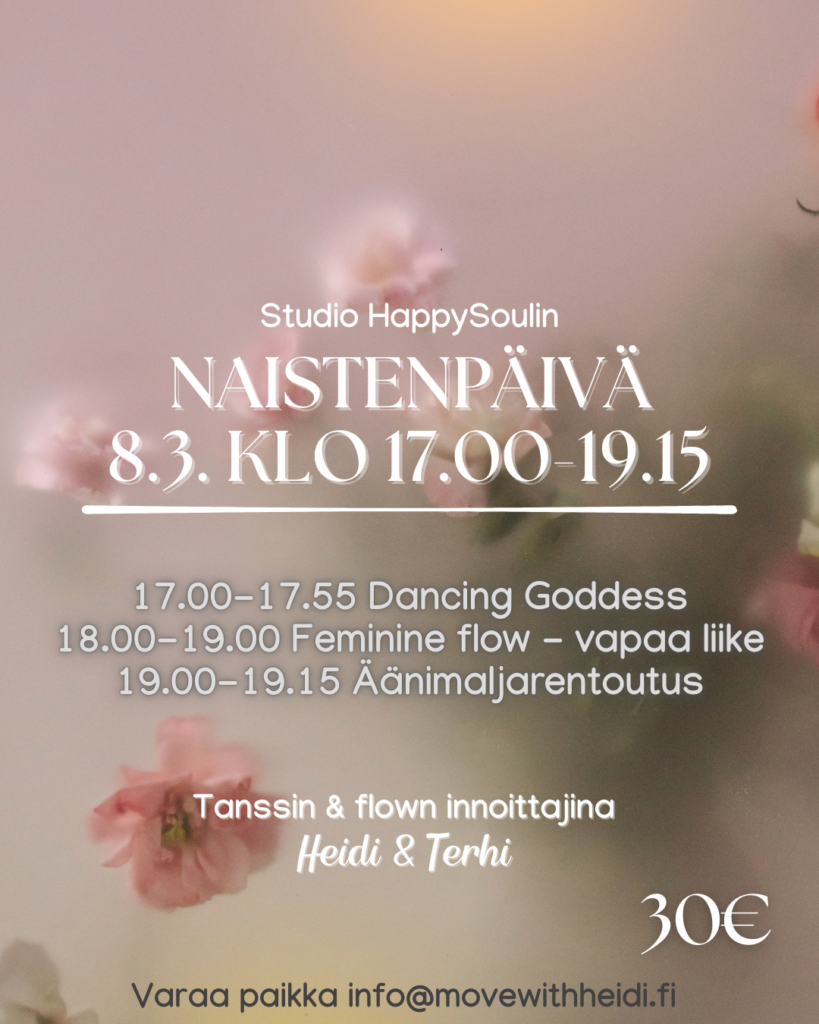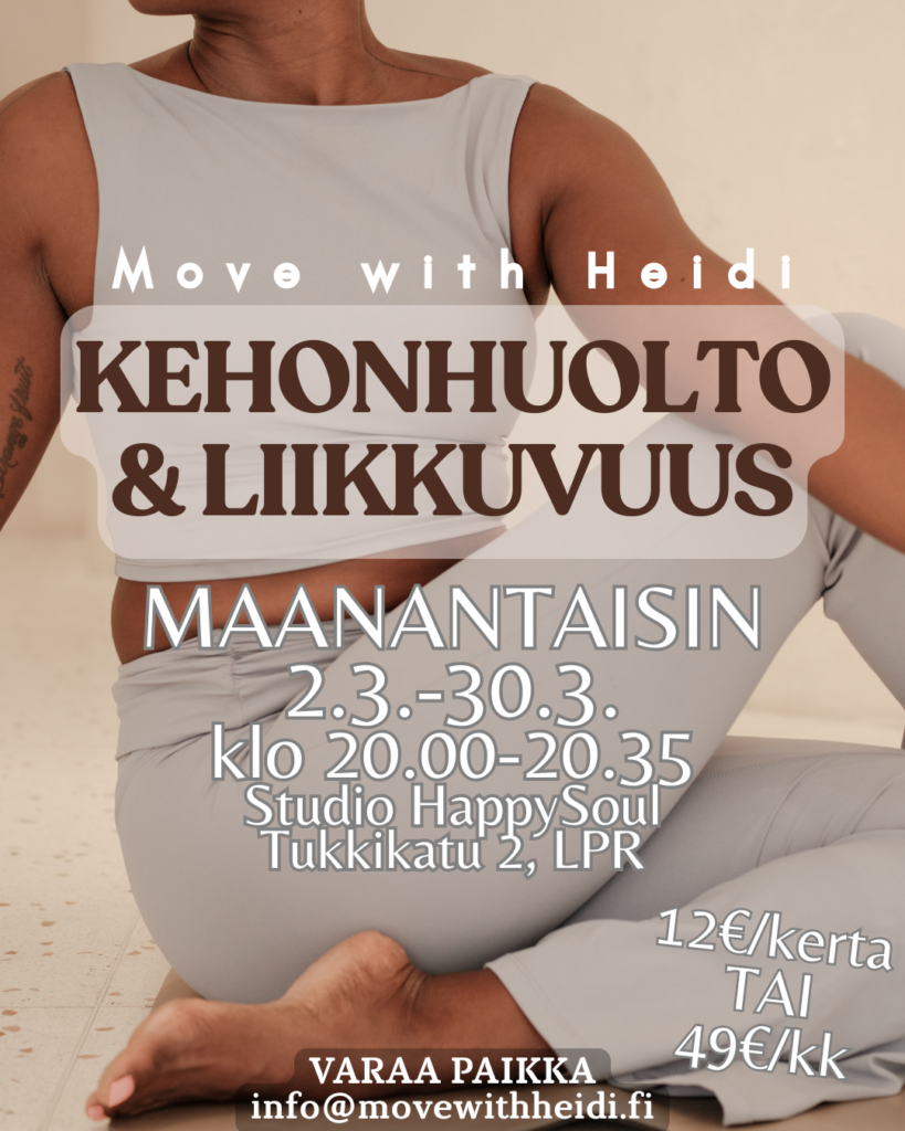 Jos suunnitteillasi on ystäväporukan kesken esimerkiksi polttarit tai muu tapahtuma, johon kaipaatte liikunnallista ohjelmaa – ota rohkeasti yhteyttä! Lajina voi olla huumorilla höystetty tanssillinen tunti kuten hiphop tai salsa, rauhallinen kehonhuolto tai kunnon hikitreeni! Suunnitellaan yhdessä teille sopiva ohjelma. Ohjaukset toteutettavissa tiloissani Studio HappySoulissa (Tukkikatu 2, LPR) tai voitte ehdottaa myös muuta paikkaa.
