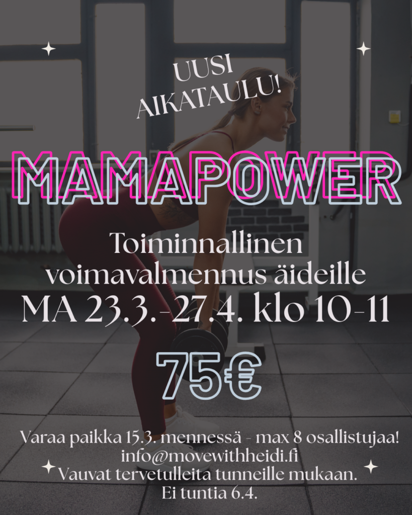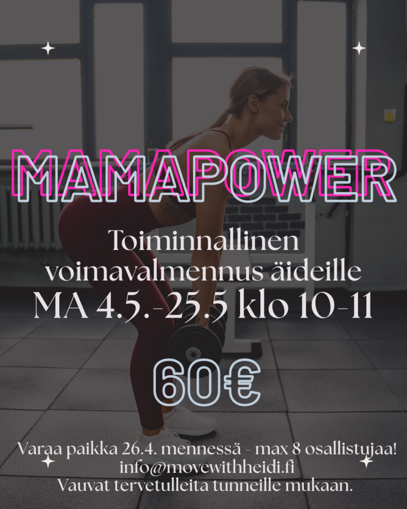 MAMAPOWER-VALMENNUS on äideille suunniteltu nousujohteinen valmennus, joka voidaan toteuttaa pienryhmänä tai yksilövalmennuksena. Tämä valmennus sopii sinulle, joka haluat aloittaa treenaamisen turvallisesti, mutta nousujohteisesti. Valmennukseen voi osallistua kun synnytyksestä on vähintään 3kk. Pienryhmävalmennuksista tiedotan erikseen nettisivuillani tai Instagramissa. Jos olet kiinnostunut MAMAPOWER yksilövalmennuksesta, voit ottaa minuun suoraan yhteyttä ja kerron lisää valmennuksesta!