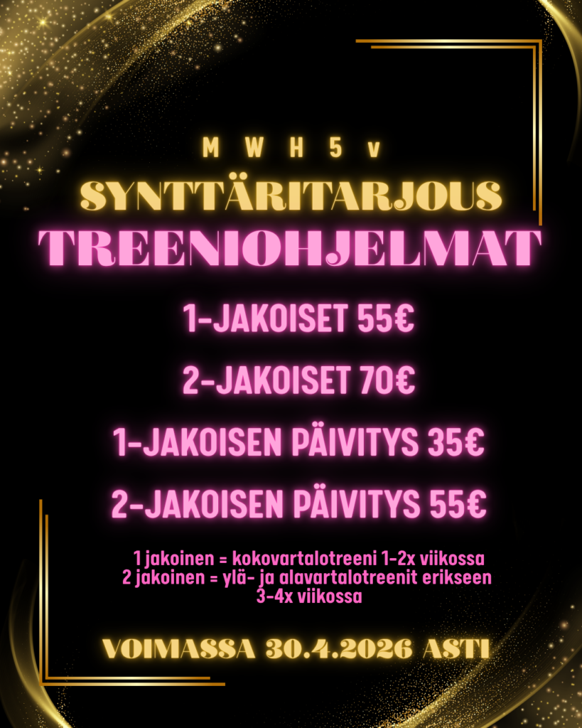 Treeniohjelmat ovat itsenäisesti suoritettavia kuntosali- tai kotitreeniohjelmia. Keskustelen kanssasi ensin puhelimitse tai sähköpostitse treeniohjelmaan liittyvistä toiveista ja tavoitteista. Toimitan sinulle treeniohjelman yksityiskohtaisten ohjeiden ja kuvien kera PDF-tiedostona sähköpostitse. Treeniohjelma voi olla esimerkiksi kuntosaliohjelma, juoksuohjelma, kehonpainotreeni tai liikkuvuus- ja kehonhuoltotreeni. Suosittelen treeniohjelman päivitystä noin 8 viikon välein, jotta kehosi saa uusia ärsykkeitä ja kehitys on nousujohteista. Suunnittelen treeniohjelmia myös odottaville ja synnyttäneille äideille.