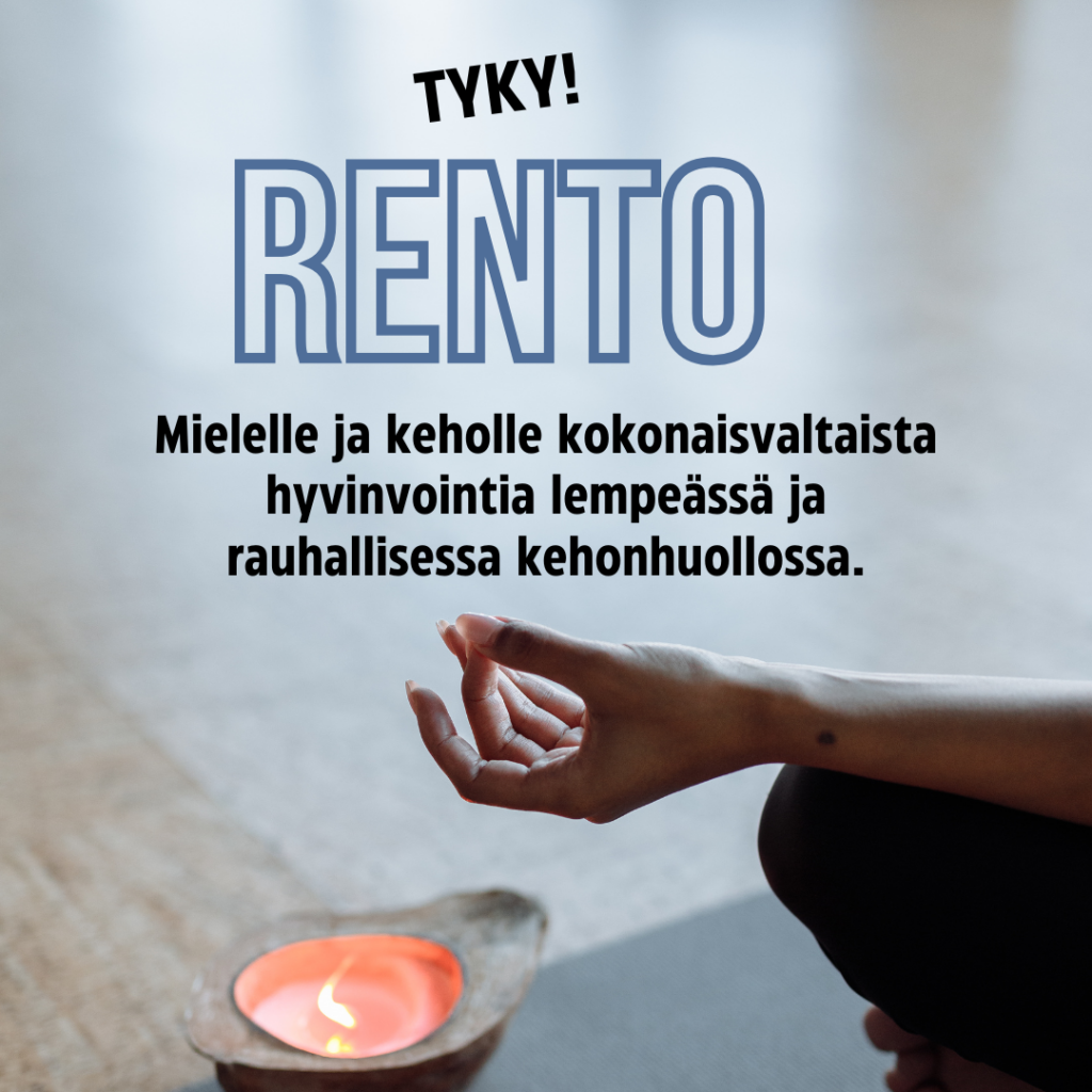 Tyky! RENTO on mielen ja kehon kokonaisvaltaista hyvinvointia edistävä tunti, jossa yhdistyy lempeä ja rauhallinen kehonhuolto sekä liikkuvuusharjoittelu. Tunnin päätteeksi lyhyt loppurentoutus, johon voidaan myös halutessa yhdistää n.10min kestoinen äänimaljarentoutus.