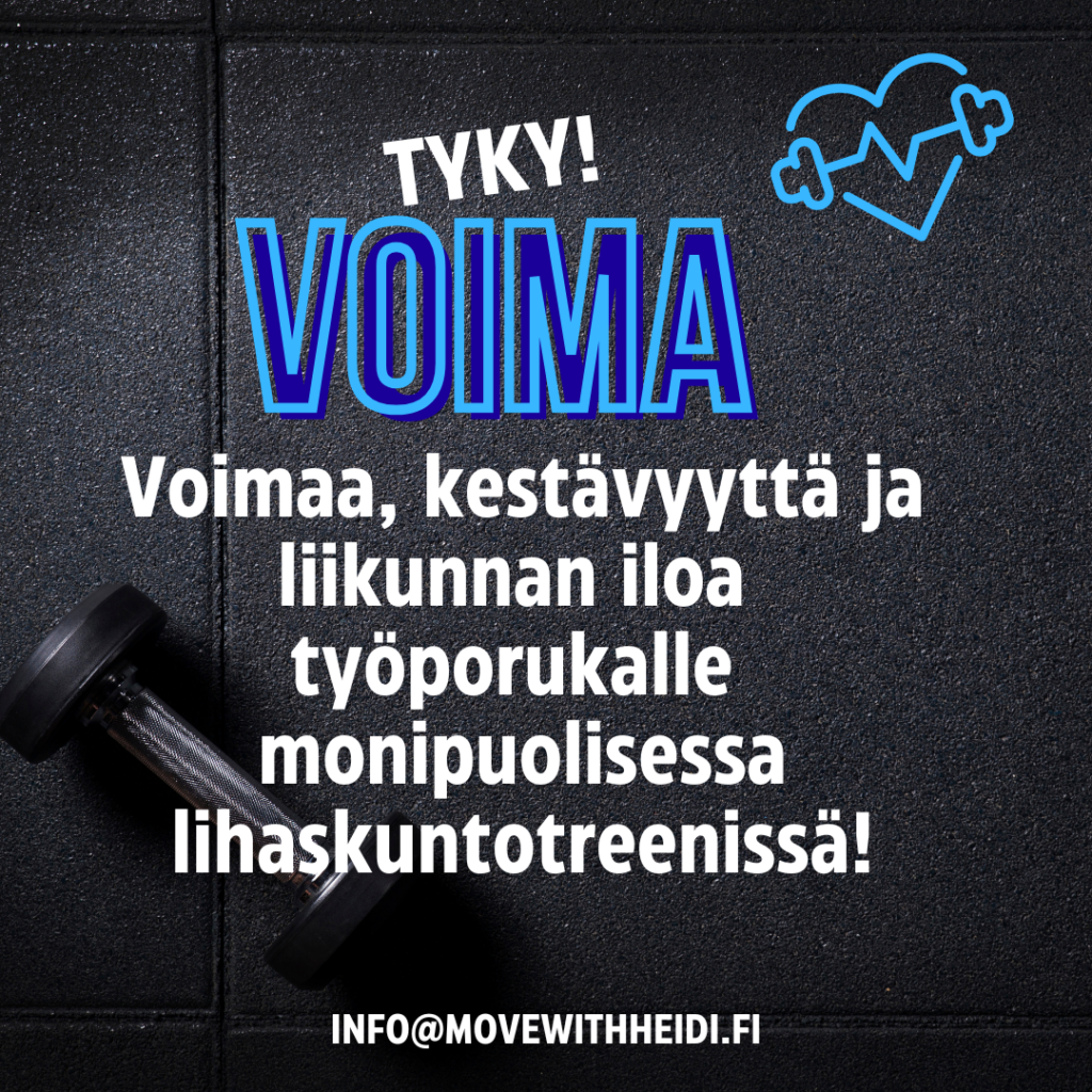 Tyky! VOIMA – voimaa, kestävyyttä ja parempaa työkykyä työtiimille lihaskuntotreenissä! Ohjelma voidaan soveltaa kaikille kuntotasoille sopivaksi ja lajitoiveita kuulen myös mielelläni. Lajina voi olla esim. kehonpainotreeni, HIIT-treeni, leikkimieliset olympialaiset tai kiertoharjoittelu erilaisia pienvälineitä hyödyntäen. Ohjaus Studio HappySoulissa (Tukkikatu 2) tai yhdessä sovitussa paikassa.