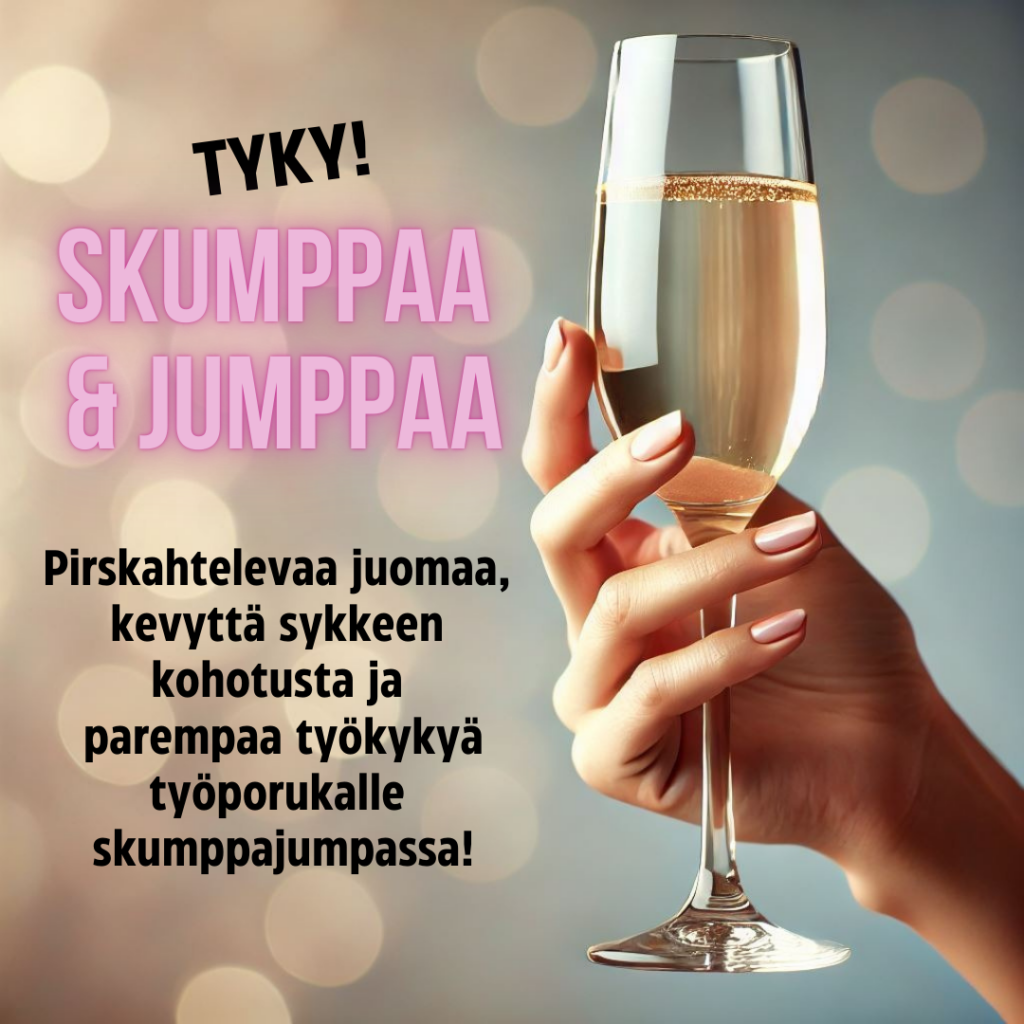 Tyky! SKUMPPAA & JUMPPAA on hyvän mielen kevytjumppaa, jossa treenin aikana siemaillaan samalla kuohujuomaa. Tunnilla tehdään helppoja koko kehon lihaskuntoliikkeitä ja saatatpa päästä harjoittelemaan myös tasapainoilua kuohujuoman kanssa! Tunnin tempo voi olla rauhallinen tai menevä, teidän toiveiden mukaisesti.